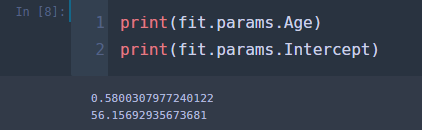 코드를 실행하면 다음과 같이 모형에 대한 정보가 출력됩니다. 빨간색 네모 박스를 보시면 Age에 대응하는 회귀 계수의 $p$-value가 굉장히 작다는 것을 확인할 수 있고 따라서 회귀 계수가 유의미하다는 것을 알 수 있습니다.