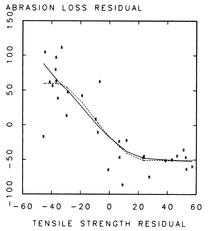 이 논문에서는 Abrasion Loss Data를 이용하여 Abrasion Loss와 Tensile Strenth의 Partial Regression Plot을 그려보고 여기에 LWR과 RLWR 모형을 적용시키고자 한다. 이때 RWLR에서 알고리즘 2~3단계 반복 횟수 $t=2$로 설정하였으며 LWR, RLWR 양쪽 모두 $f=0.5, d=1$을 선택하였다. 그리고 $W$는 tricube 함수로 설정하였다.