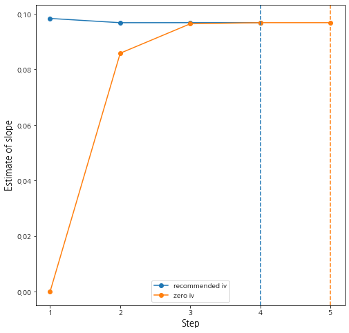 추정량은 정확하지만 스텝 한 번이 더 늘어났다. 첫 번째 초기값이 더 좋긴 하지만 초기값을 0으로 놓고 해도 동일한 결과를 얻는다. 다음은 초기값에 따른 기울기 추정량의 변화를 시각화해보았다.