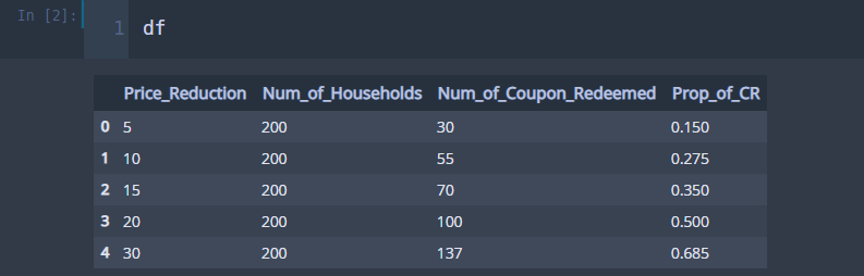데이터를 간단하게 설명하자면 5가지의 할인율(Price_Reduction)이 적용되는 쿠폰을 각 할인율별로 200가구(Num_of_Households)에 뿌렸다고 한다. 이때 쿠폰을 사용한 가구의 비율(Prop_of_CR)과 할인율과의 관계를 알아보는 것이 이 데이터 분석의 목적이라고 한다.