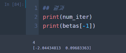 총스텝은 3번이며 최종 추정량에서 절편은 -2.0443, 기울기는 0.0968로 나왔다. 이번엔 초기값을 모두 0으로 두고 모형 적합을 해보자. 코드 부분에서 초기값만 아래와 같이 바꿔준다.