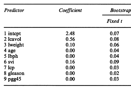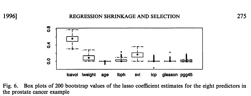 저자는 이 논문 제시하는 추정 방법을 특별히 LASSO(Least Absolute Shrinkage and Selection Operator)라 칭하였고 이는 회귀 계수를 축소시켜주어 분산을 작게하고 특정 회귀 계수를 0으로 추정함으로써 변수 선택의 이점을 갖는다고 한다. 즉, LASSO는 능형 회귀와 변수 선택의 장점을 동시에 누리는 것이다.