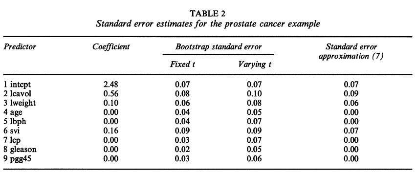 $t$는 회귀 계수 $\beta_j$를 얼마나 축소시킬지 조절하는 모수이다. $\hat{\beta}^o$를 최소 제곱 추정량, $t_0=\sum_j|\hat{\beta_j^o}|$라 하자. 만약 $t<t_0$라면 (1)의 해는 최소 제곱 추정량을 축소시킨 해가 나오게 되며 $t\geq t_0$라면 (1)의 해는 최소 제곱 추정량과 같아진다. 논문에서는 $t=t_0/2$인 경우 변수의 개수가 $p/2$인 최적 모형을 찾는 것과 대략적으로 비슷해진다고 한다(뭔가 억지로 껴 맞추는 말인 거 같은데 훌륭한 분들이 썼으니 내가 모르는 의미가 있을 것 같다).