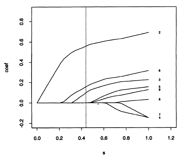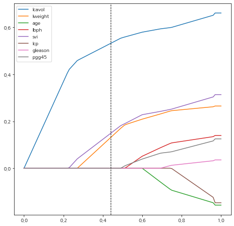다음 코드는 $s$의 값을 정해둔 뒤 이를 $t=s\cdot\sum_j|\hat{\beta}_j^o|$로 바꾸어준다. 그리고 각 $t$에 대하여 LASSO 추정량을 구한다.