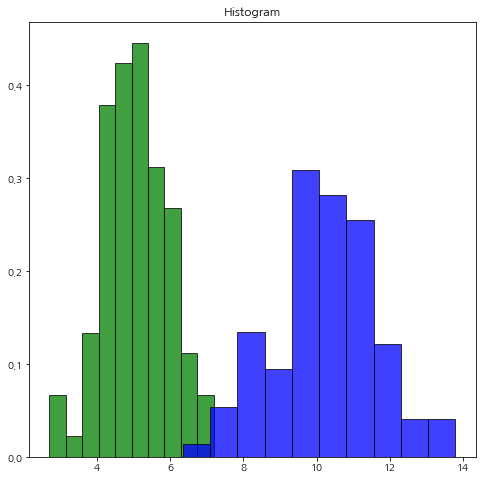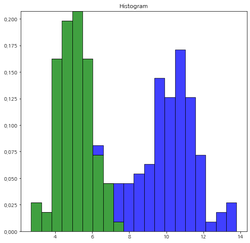위 코드를 실행하면 아래와 같이 히스토그램 2개가 겹쳐서 나타나게 됩니다.