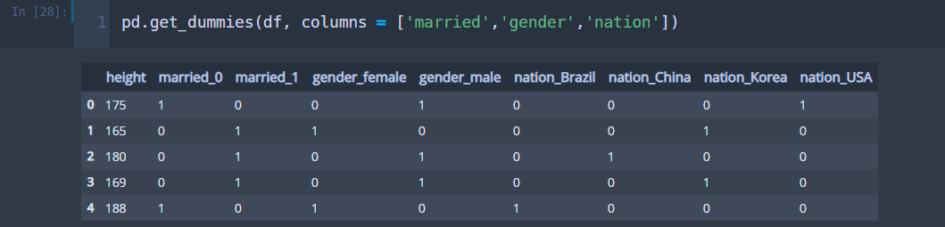 아래 코드는 위 함수를 이용하여 married 칼럼에는 1, nation 칼럼에는 Korea를 제외시키고 가변수로 변환합니다.