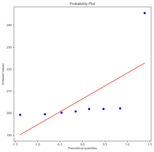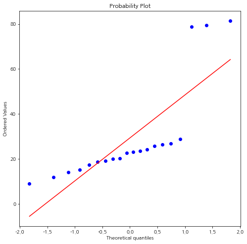 Q-Q plot을 확인해보니 이상치를 제외하면 직선 형태이므로 데이터가 정규분포로부터 추출되었다고 볼 수 있다.