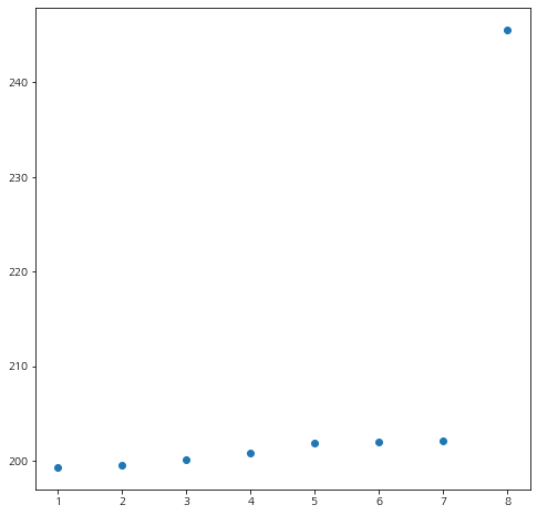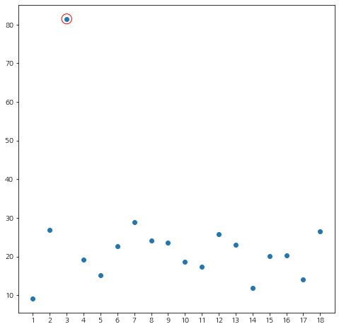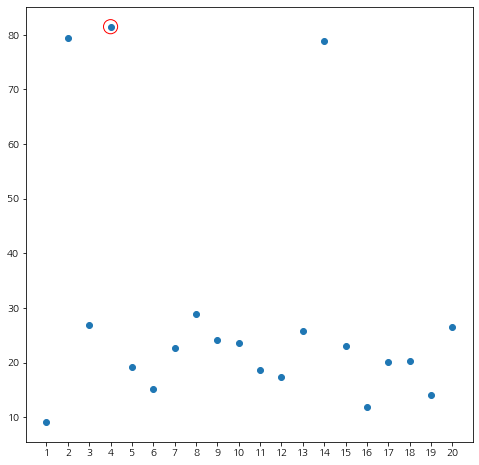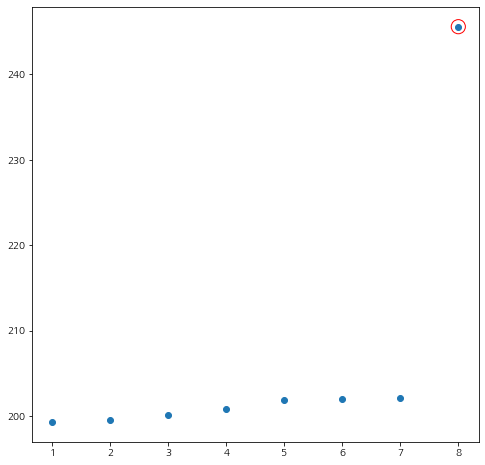 역시 예상했던 대로 이상치가 발견되지 않았다. 이번엔 이상치가 하나 있는 데이터로 바꿔서 해본다. 데이터만 아래 걸로 바꾸고 위 코드를 실행하자.