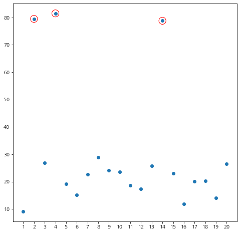 Grubbs's Test를 이용하여 이상치를 판단해보자. 아래 코드는 검정 결과와 이상치라 판단되는 점을 표시한 것이다.