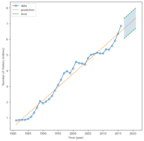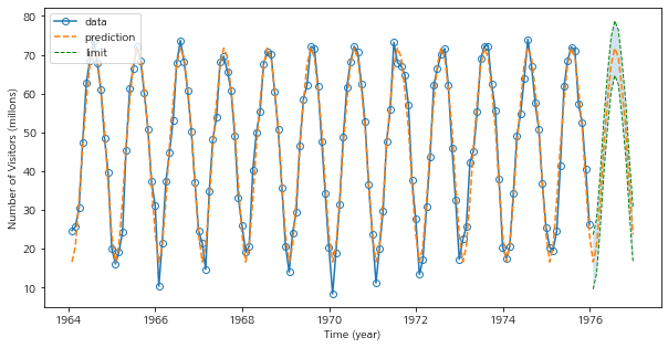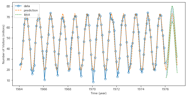 이제 예측값과 예측구간을 구해본다. 난 향후 5년까지의 예측값과 95% 예측 구간을 구할 것이다.