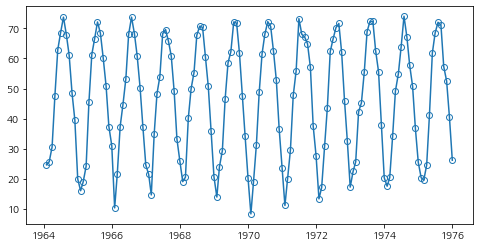 plt.plot(df['visitors'],marker='o',markerfacecolor='none')