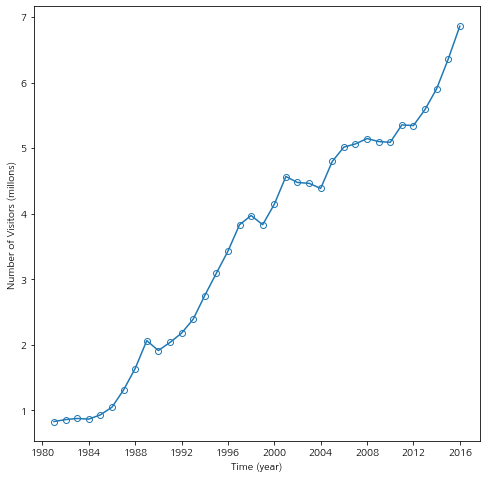 이번엔 실제 데이터를 이용해서 선형 추세를 모델링해보자. 먼저 데이터를 다운받자. 이 데이터는 1980년부터 2015년까지 오스트레일리아 방문자 수를 나타낸 것이다.